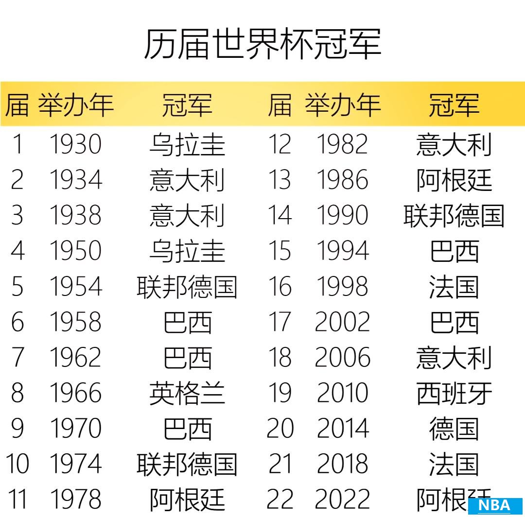 历届世界杯冠军-历届世界杯冠亚军一览表(图表)